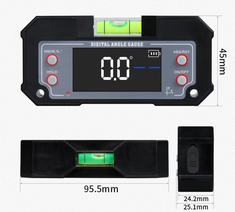 This high precision dual axis digital bubble inclinometer delivers accurate measurements with ±0.2° (single-axis) and ±0.3° (dual-axis) accuracy, covering ranges of 4x90° and ±60° respectively. Featuring a robust magnetic base, a clear digital display with 0.1° resolution, and a rechargeable 3.7V lithium battery with Type-C charging, it is a versatile and reliable tool for precise leveling, alignment, and inspection tasks in workshops and industrial settings.