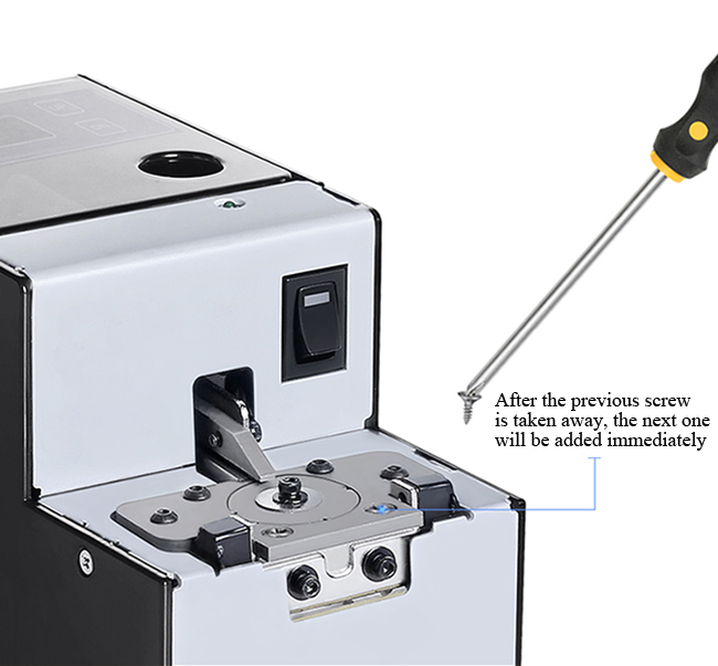 Automatic screw feeder with digital display and larger storage bin. Screw discharge method brushless adsorption turntable-type. Applicable screws M2.0, M2.3, M2.6, M3.0, M3.5, M4.0, M5.0, M6.0. Screw length≤30mm, head thickness≥0.2mm, capacity 600cc. The machine is suitable for screws with a little large volume.